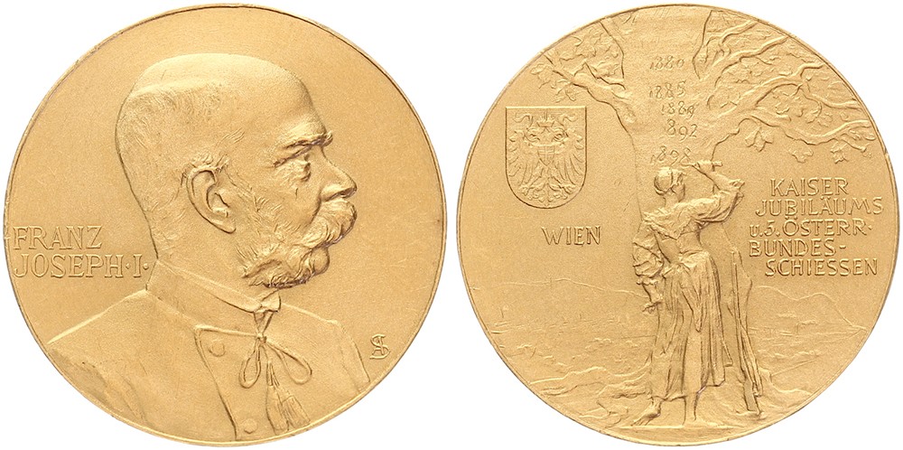 1898 Wien. Kaiser Jubiläums und 5. Österreichische Bundesschiessen. Brustbild Franz Joseph I. nach rechts. / Weibliche Gestalt steht v.v. und schneidet in eine Eiche die Jahreszahl 1898. AU 26,3 [12,16 g]. Hauser 5212. A. Scharff. Selten. Fast Stempelglanz.