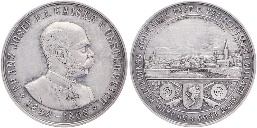 1899 Villach. Regierungsjubiläum Franz Joseph (1898) und Freischiessen. Brustbild Franz Joseph in Schützentracht nach rechts. / Ansicht von Villach über Wappen, Gewehren und Schützenscheiben. AR 40,2 [29,60 g]. Hauser 5243. Balmberger et al. Gutes sehr schön. N.B. Ex Auktion 46 H.D. Rauch, Mai 1991, Los-Nr. 1018