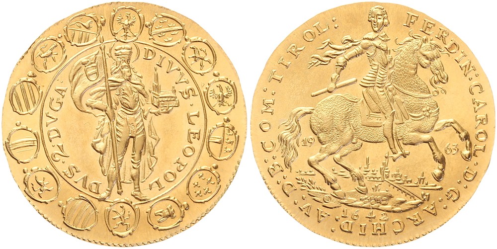 1963 Nachprägung 2 Dukaten 1642 Erzherzog Ferdinand. AU 27 [6,98 g, 986/1000]. (Fr. 247). Stempelglanz.