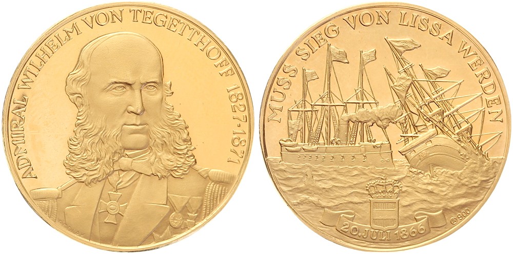 (1966) Admiral Wilhelm von Tegethoff, auf seine Sieg bei Lissa. Brustbild in Marineuniform etwas nach rechts. / Seeschlacht. AU 28 [10,00 g, 900/1000]. Stempelglanz.