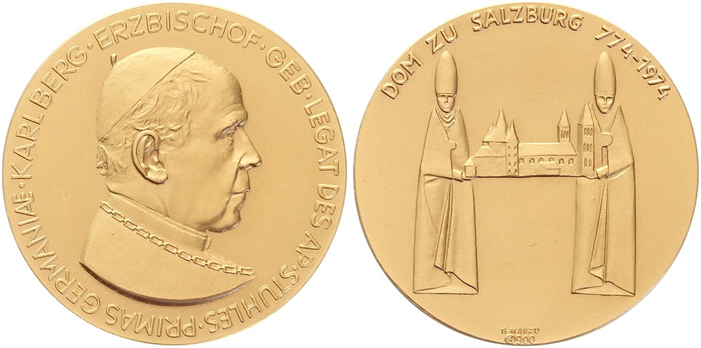 1974 Salzburg. Erzbischof Karl Berg. Brustbild nach rechts. / Dom zu Salzburg (774-1974) zwischen zwei Bischofe. AU 28 [14,93 g, 900/1000]. G. Manzu. Stempelglanz.