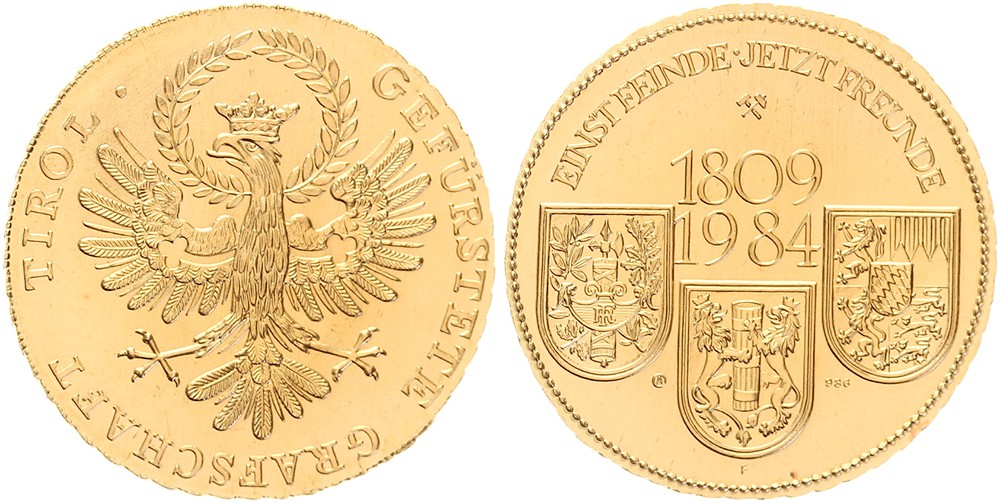 1984 Tirol. 175 Jahre Jub. Andreas Hofer. Adler mit Lorbeerkranz. / Drei Wappen mit Jubiläumdata. AU 27,5 [6,96 g, 986/1000]. Auflage: 500 Ex. Fast Stempelglanz.