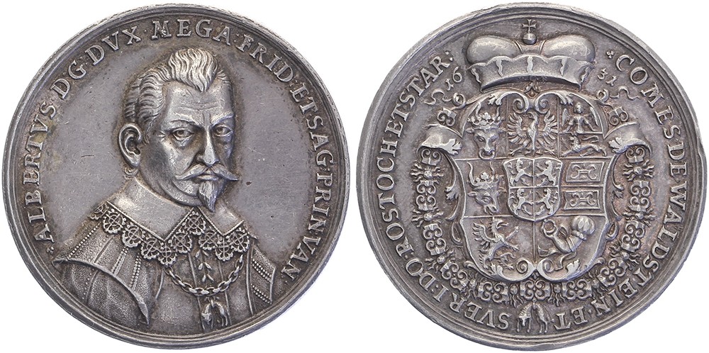 1631 Friedland. Albrecht von Wallenstein (1583-1634). Geharnischtes Brustbild fast von vorn mit der Kette des Ordens vom Goldenen Vlies. / Driezehnfeldiges Wappen in Barockkartusche. AR 38,6 [30,06 g]. Nachahmung von P.Ch. Becker (18. JH). Fiala 3969. Sehr schön.