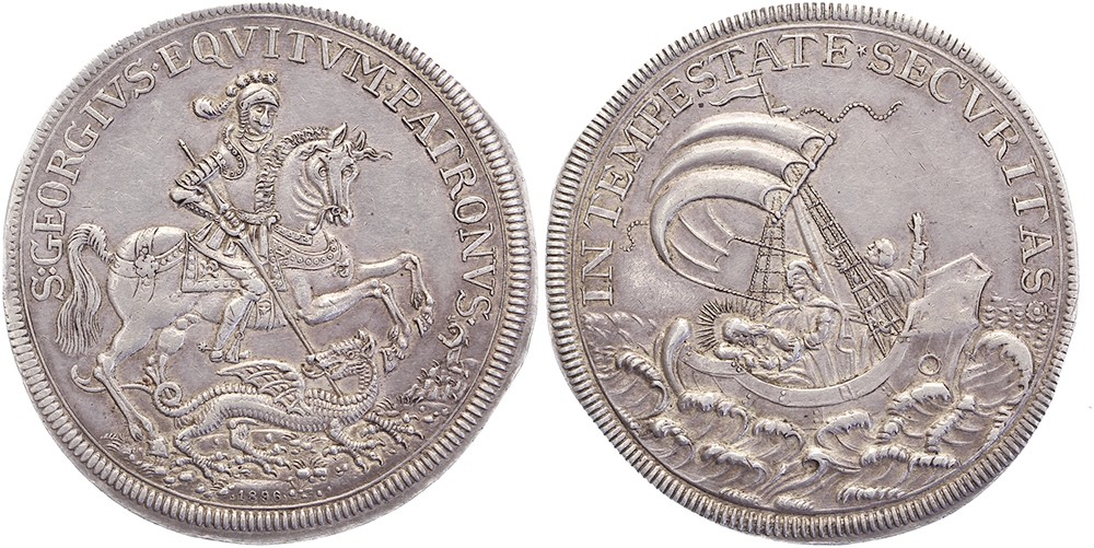 (± 1700) “St. Georgsthaler” nach Mansfelder Art. Den heiligen Georg als Ritter mit dem Drachen kämpfend. / Ein Segelschiff mit schläfende Christus in Sturm. AR 45,5 [27,22 g]. Möglich Kremnitzer Münze. Vorzüglich.