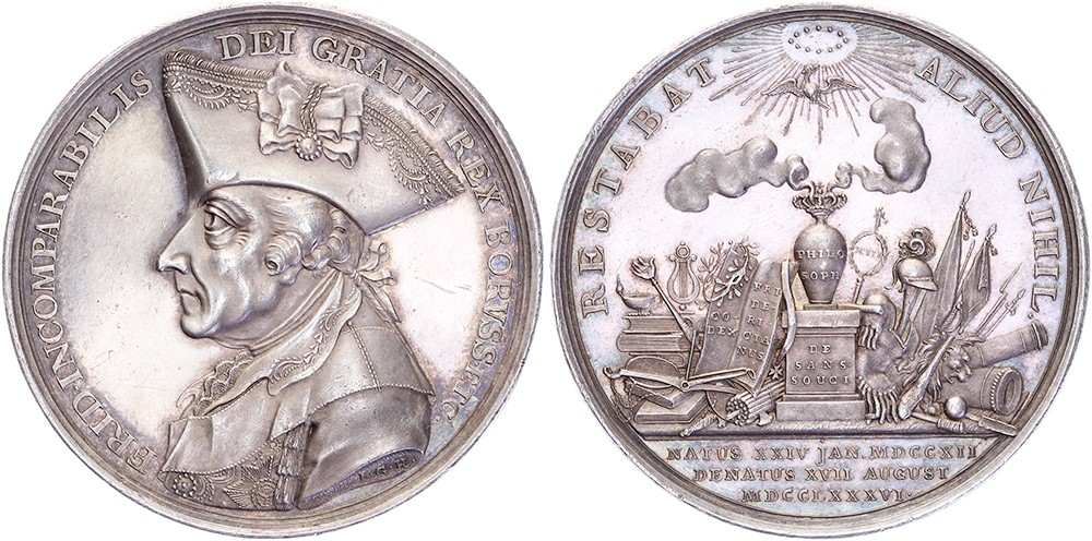 1786 Auf den Tod Friedrich II. von Preußen. Brustbild in Uniform mit Ordensstern und Dreispitz nach links. / Eine bekrönte rauchende Urne, umgeben von Symbole des Friedens und Krieges. AR 45 [24,23 g]. DPR IV-2048; KPK 3486; Olding 753. J.G. Holtzhey. Excellent Patina. Vorzüglich.