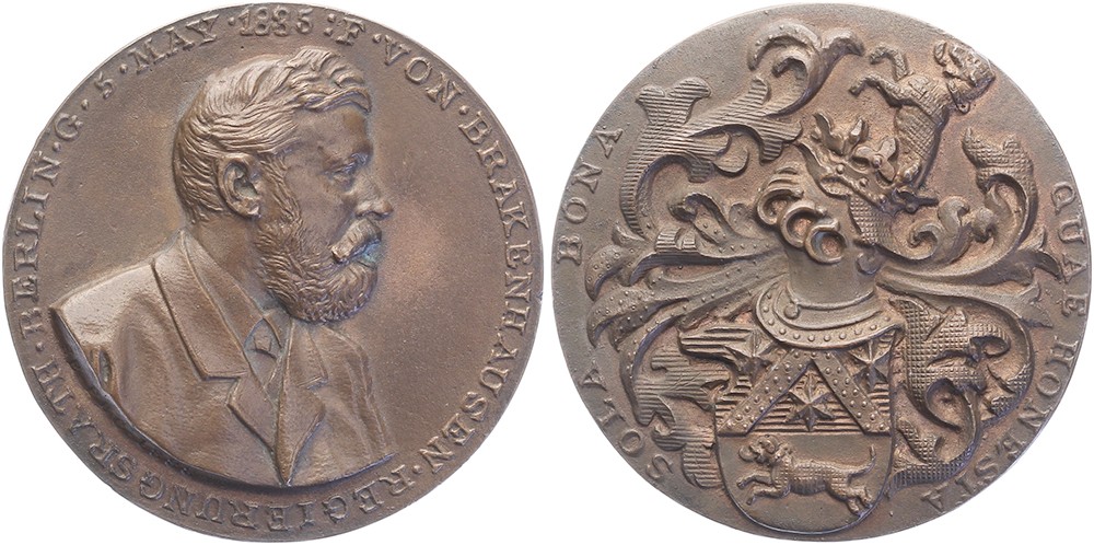 1888 Zum Ehre F. von Brakenhauser, Regierungsrath Berlin. Büste nach rechts. / Behelmtes Wappen. Bronzeguß 72. Von S.B. ? Fleck um den Mund, sonst vorzüglich.