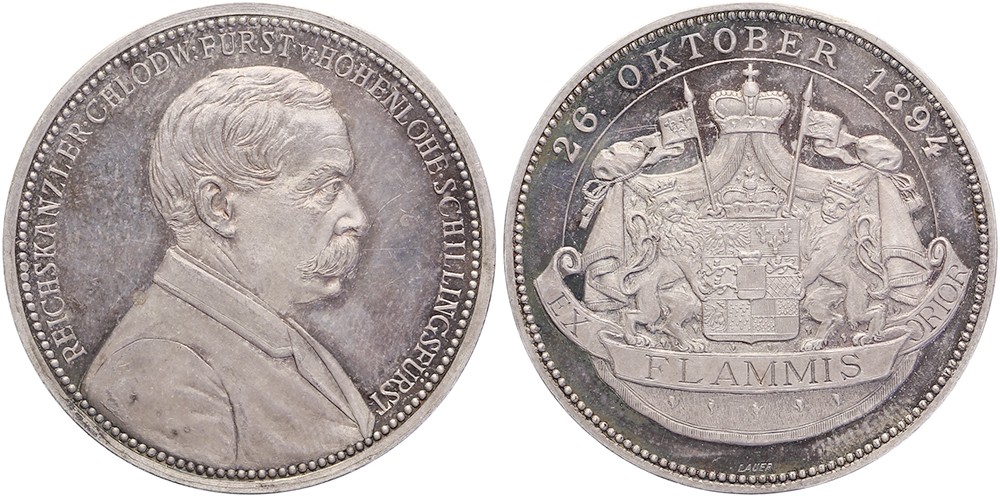 1894 Chlodwig Fürst von Hohenlohe-Schillingfürst wird Reichskanzler. Brustbild nach rechts. / Wappenschild gehalten von zwei Löwen im Mantel. Randgravierung: GEDENK MÜNZE AR 33 [18,07 g]. Lauer. Fast Stempelglanz.