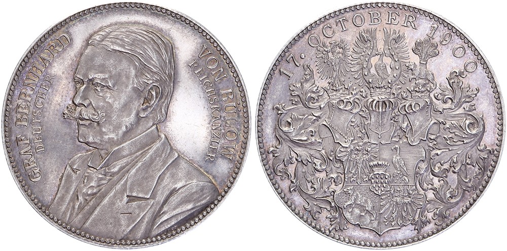 1900 Zum Ehre Graf Bernhard von Bülow, Reichskanzler. Brustbild nach links. / Dreifach behelmtes Wappen mit Helmzier. AR 32 [18,28 g]. Slg. Marienburg IV-7639. Lauer. Vorzüglich / Stempelglanz.