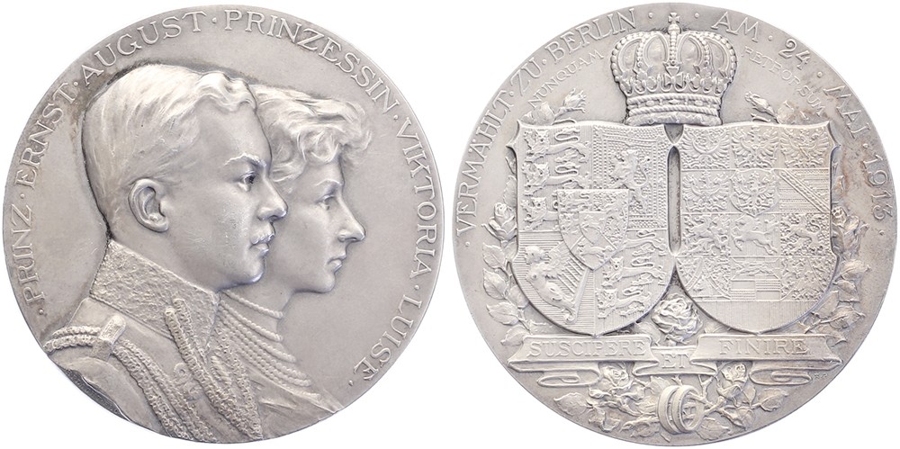 1913 Berlin. Vermählung Prinz Ernst-August und Prinzessin Viktoria-Luise. Doppelporträt nach rechts. / Zwei Wappen unter Krone. AR 56 [78,50 g]. Brockmann 576. R. Placht. Vorzüglich.