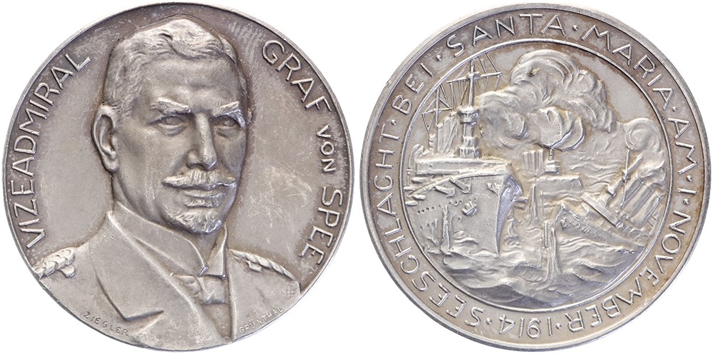1914 Vizeadmiral Graf von Spee (1861-1914); Seeslacht bei Santa Maria. Brustbild in Uniform halbrechts. / Seegefecht. AR 34,3 [18,13 g]. Zetzmann 4047. M. Ziegler & H. Grünthal. Vorzüglich.