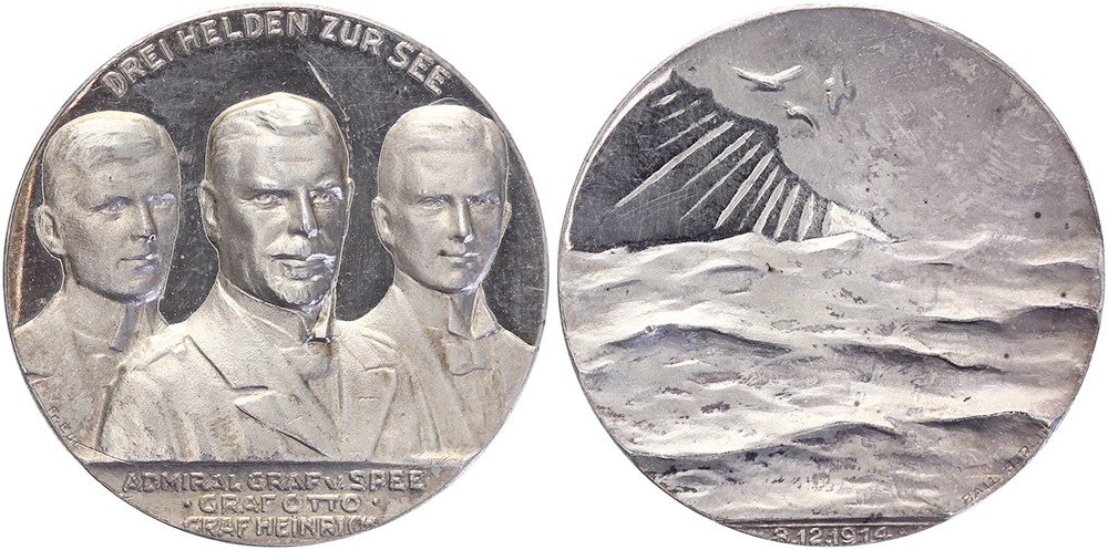 1914 Drei Helden zur See. Brustbilder von Vizeadmiral von Spee und seiner beiden Söhne, Graf Otto und Graf Heinrich. / Wasseroberfläche mit drei Möwen. AR 34,9 [18,59 g]. Zetzmann 6007. F. Eue. Vorzüglich.