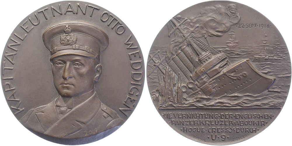 1914 Auf die Versenkung der englischen Panzerkreuzer ‘Aboukir’, ‘Hogue’ und ‘Cressy’ durch U9. Brustbild Kapitän Leutnant Otto Weddigen in Uniform halblinks. / Sinkender Panzerkreuzer. Bronzeguß 104,6. Zetzmann 4003-Anmerkung. Ziegler & Grünthal. “20.9” auf Brust Weddigen. Aüßerst Selten. Vorzüglich.