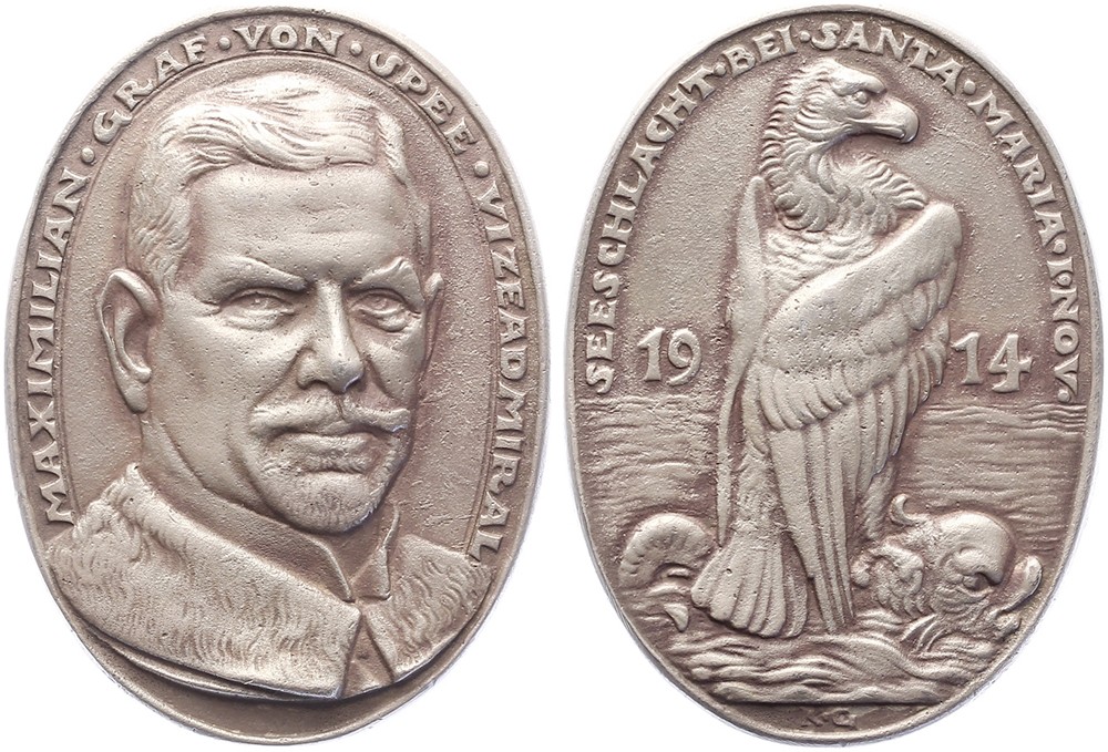 1914 Vizeadmiral Graf von Spee (1861-1914); Seeslacht bei Santa Maria. Brustbild etwas nach rechts. / Adler auf Fabelwesen im Meer sitzend. Silberguß (oval) 64,5 x 47,2 [52,98 g]. Kienast 145; Zetzmann 4048. Vorzüglich.