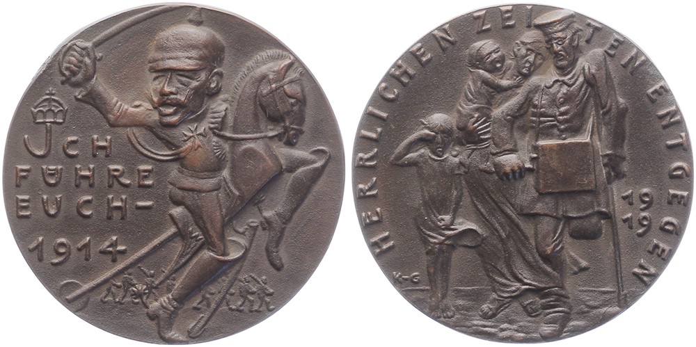 1919 ‘Herrliche Zeiten’. Kaiser Wilhelm II. mit Steckenpferd. / Familie mit kriegversehrten Vater. Bronzeguß 58,5. Kienast 238. Vorzüglich.