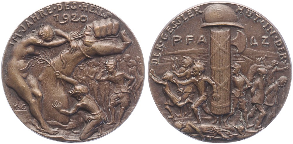1920 Der Gesslerhut in der Pfalz. Eine nackte Frau an einen grossen, zur Faust geballten Arm gefesselt; daneben französischer Soldaten. / Helm auf Fascesbündel und Menschenmenge. Bronzeguß 60. Kienast 265. N.B. Ex Auktion 10 Laurens Schulman, April 1993, Los-Nr. 1021
