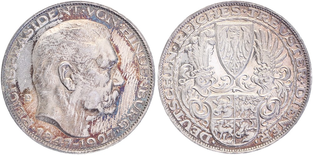 1927 Reichspräsident Von Hindenburg 80 Jahre alt. Kopf Hindenburg nach rechts. / Zweifaches behelmtes Wappen und Bundesadler. AR 36 mit Randpünze. Kienast 386; KM X1. Polierte Platte.