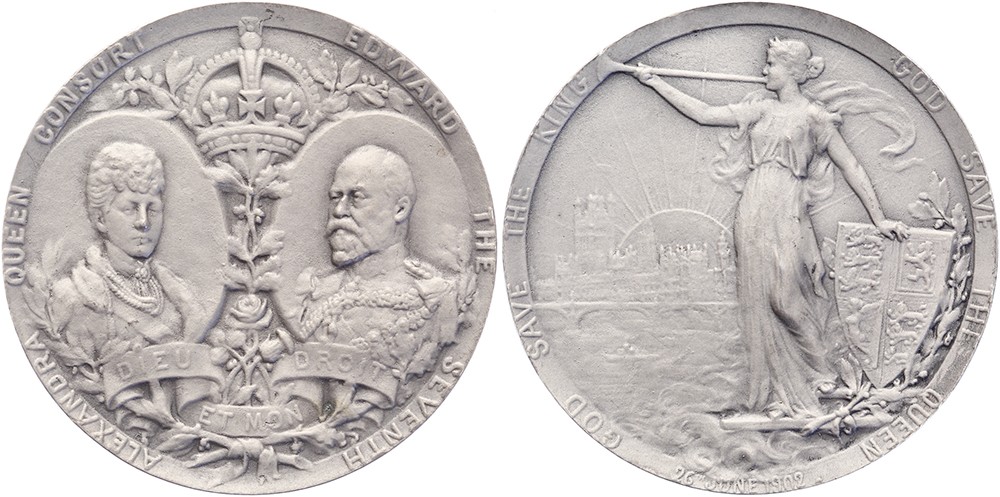 1902 Coronation of Edward VII. Busts of Alexandra and Edward in medaillons facing each other. Crown and text DIEU ET MON DROIT between. / Standing female blowing horn and holding shield. In the background parlement buildings under radiant sun. Matt AR 51 [55,36 gr.]. EF.