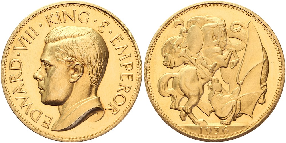 1936 In honour of Edward VIII. Head left. / Saint George slaying dragon. AU 38 [38,43 gr. = weight of £ 5]. Private issue, probably late 20th century. Proof.