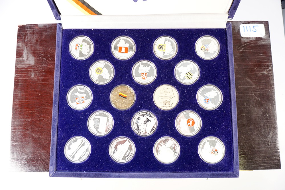 Lot (2) Houten opbergkist met 24 stuks penningen mbt. de onafhankelijkheid van België 1830-1980. Ca. 840 gram 999.9. Toegevoegd blauwe cassette 16 Ländentaler Deutschland.