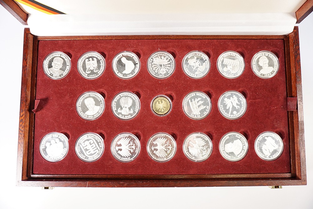 Luxe houten opbergkist met 33 stuks zilveren penningen mbt. 40 Jahre Bundes Republiek Deutschland. Proof.