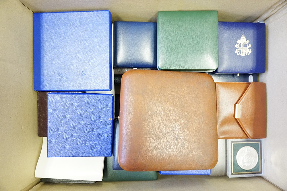 Grote kartonnen doos met veelal grootformaat penningen diverse (Europese) landen in originele doosjes (39). Hier en daar wat zilver.