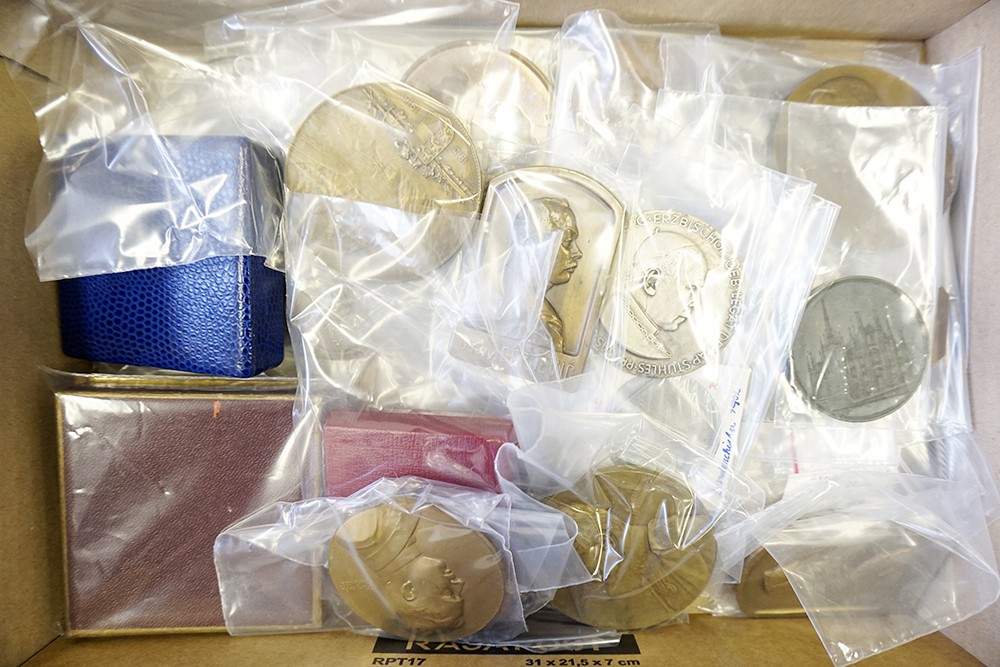Kartonnen doos vol interessante penningen van Oostenrijk, vnl. grootformaat, 19e en 20e eeuw. Diverse metalen (53).