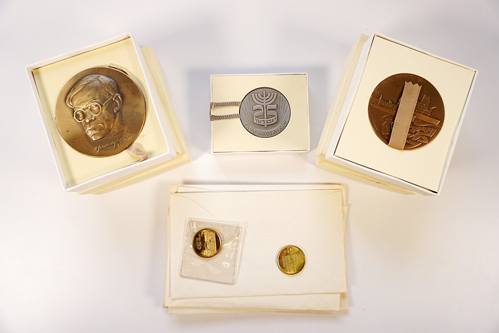 Doosje met zeven penningen van Israël waarvan 1 in zilver.