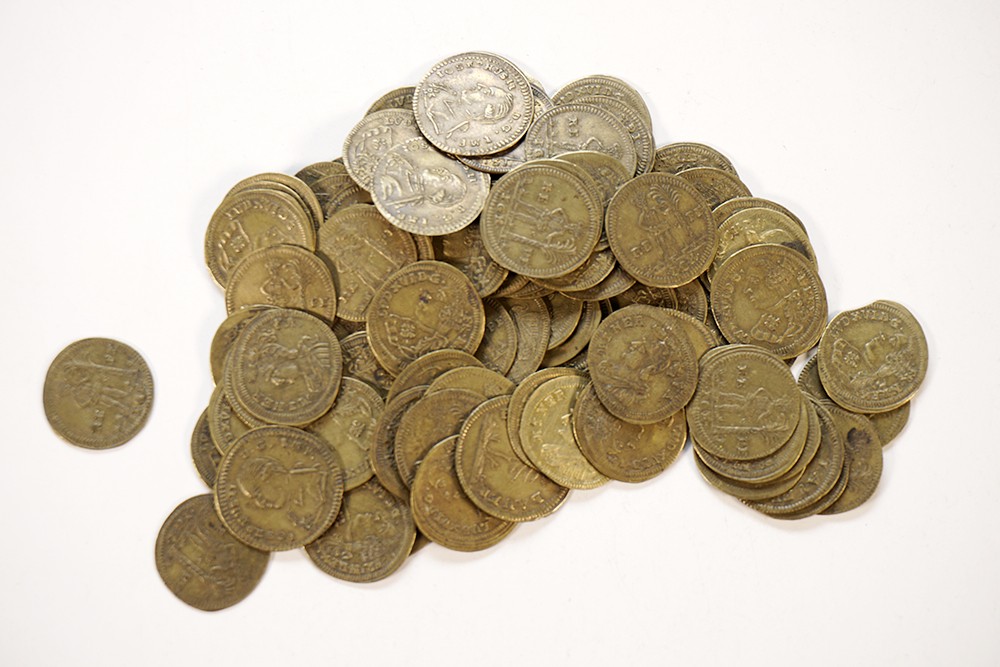 Blikje met ruim 80 stuks Neurenbergse rekenpenningen.