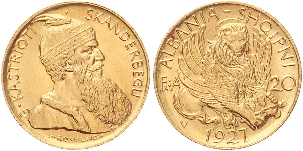 20 Franga Ari 1927V Skanderberg. Fr. 6; KM 12. EF.