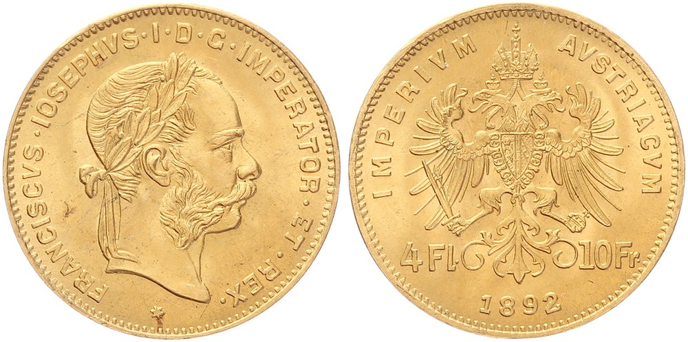 4 Florins-10 Francs 1892 restrike. KM 2260; Fr. 503R; J.361. Vorzüglich.