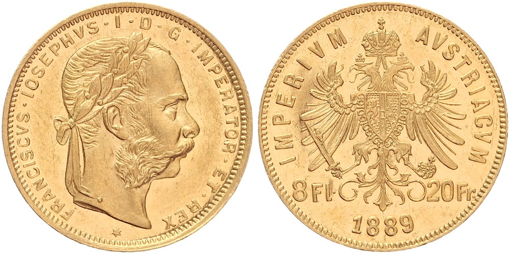 8 Florins-20 Francs 1889. KM 2269; Fr. 502; J. 362. Vorzüglich.