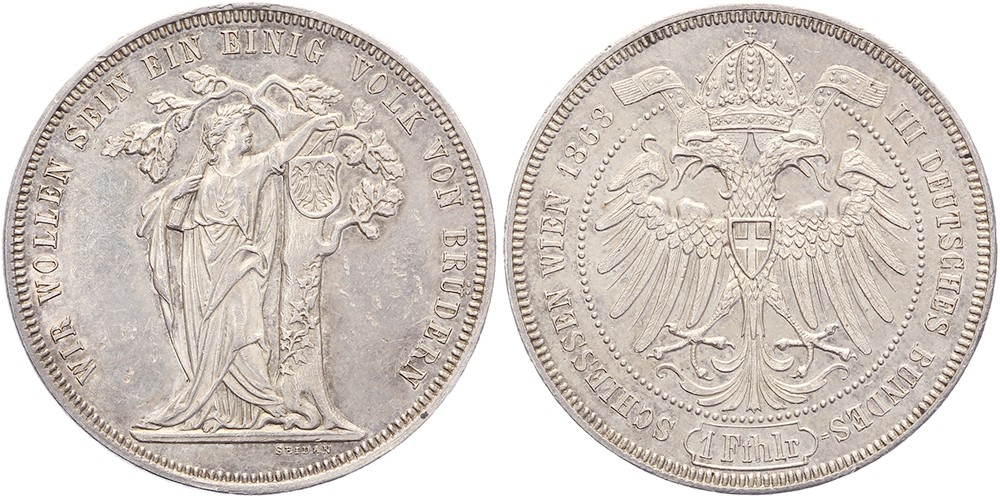 Thaler 1868 drittes deutsches Bundesschiessen in Wien. J. 371; KM XM8. Vorzüglich / Stempelglanz.