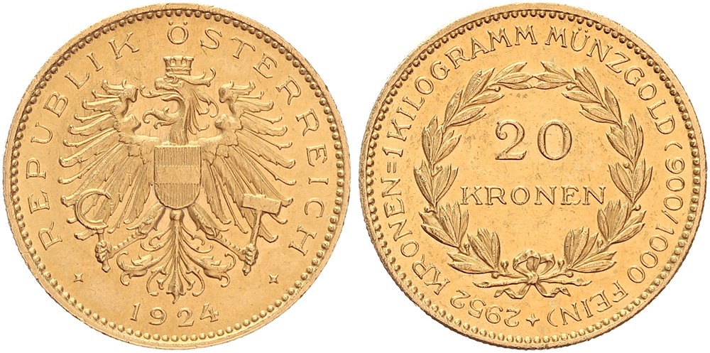 20 Kronen 1924. KM 2830; Fr. 519; J. 422. Sehr schön / vorzüglich.