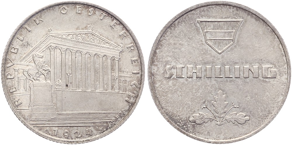 Schilling 1924. Probe in Silber. Das Wert ‘SCHILLING’ zwischen Wappen und Dreiblatt. KM Pn97. Selten. Unzirkuliert.