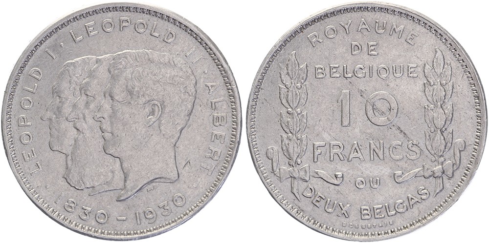 10 Francs / Deux Belgas 1930 Onafhankelijkheid. KM 99. Ruim zeer fraai.