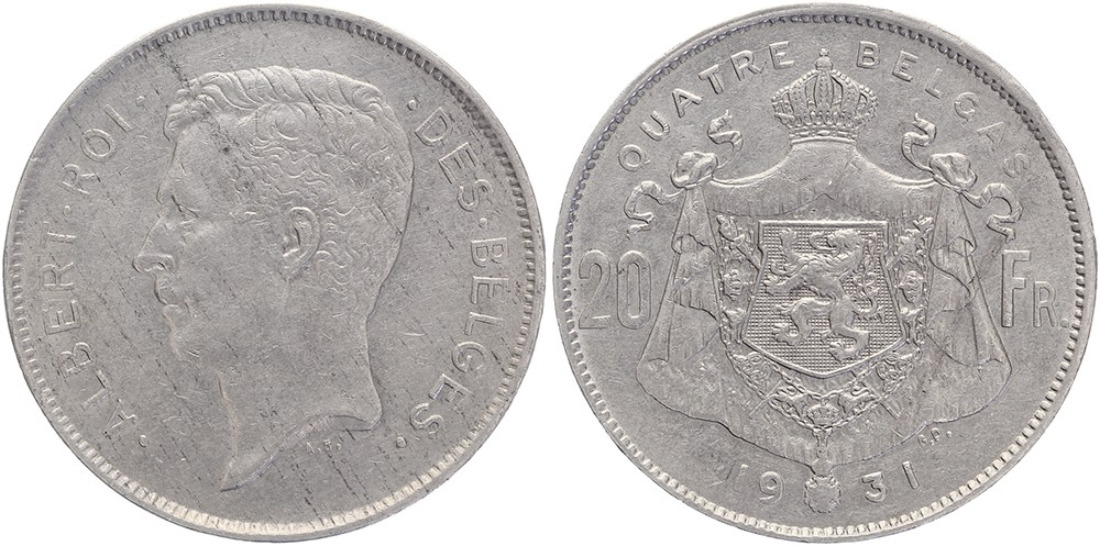20 Francs / Quatre Belgas 1931. KM 101.1. Ruim zeer fraai.