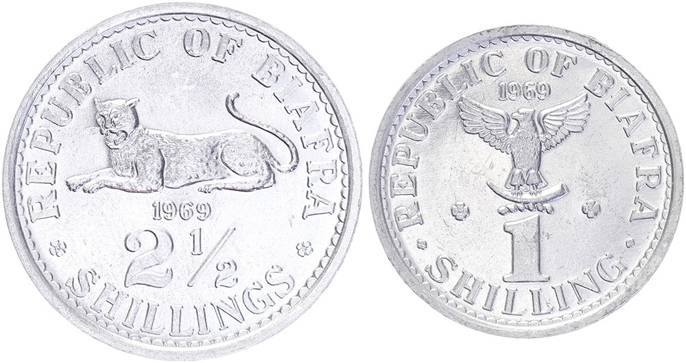 1 + 2 ½ Shilling 1969 eagle + lying cat. KM 3,4. Brill. uncirculated.