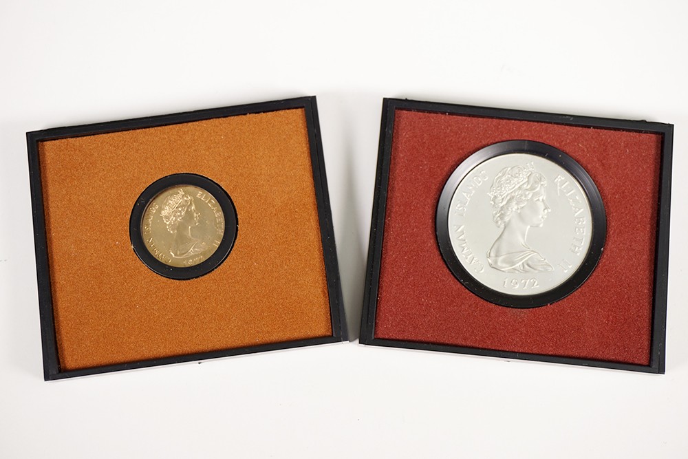 Lot (2) 25 Dollars 1972 gold, 25 Dollars 1972 silver Wedding Anniversary. KM 9 and 9a; Fr. 1. Proof.