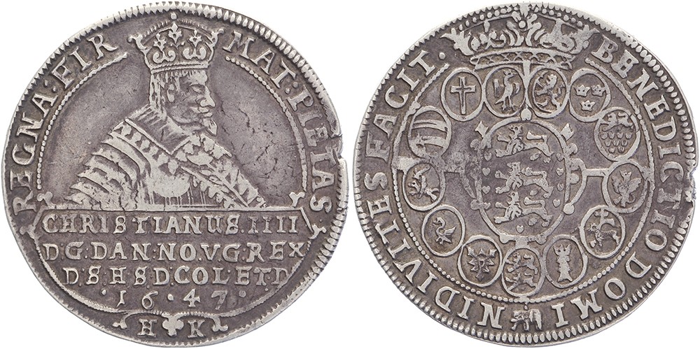 Speciedaler 1647 H-K. Hede 55; Dav. 3536; KM 143 [28,22 gr.]. Small edge defect at 3 o’clock, otherwise VF.