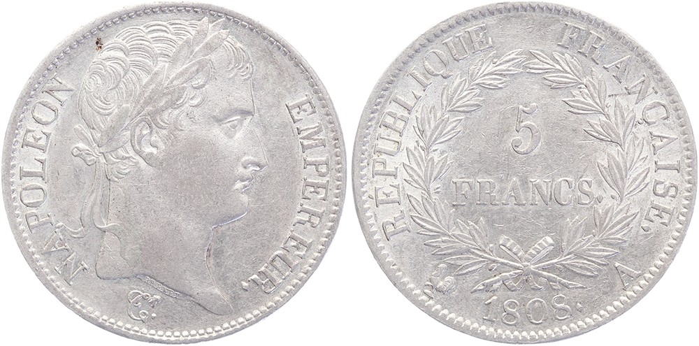5 Francs 1808A. Gadoury 583; KM 686.1. TTB / Superbe.