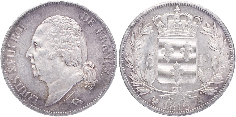 5 Francs 1816A. Gadoury 614; KM 711.1. Traces d’ajuster avers, sinon superbe.