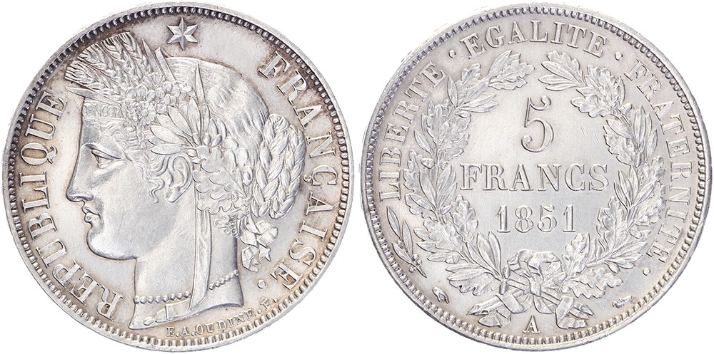 5 Francs 1851A, type Cérès. Gadoury 719; KM 761.1. Presque FDC.