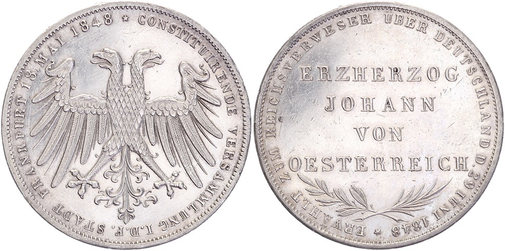 Doppelgulden 1848 Erzherzog Johann von Österreich. Davenport 644; AKS 39; KM 338. Leicht berieben. Vorzüglich.