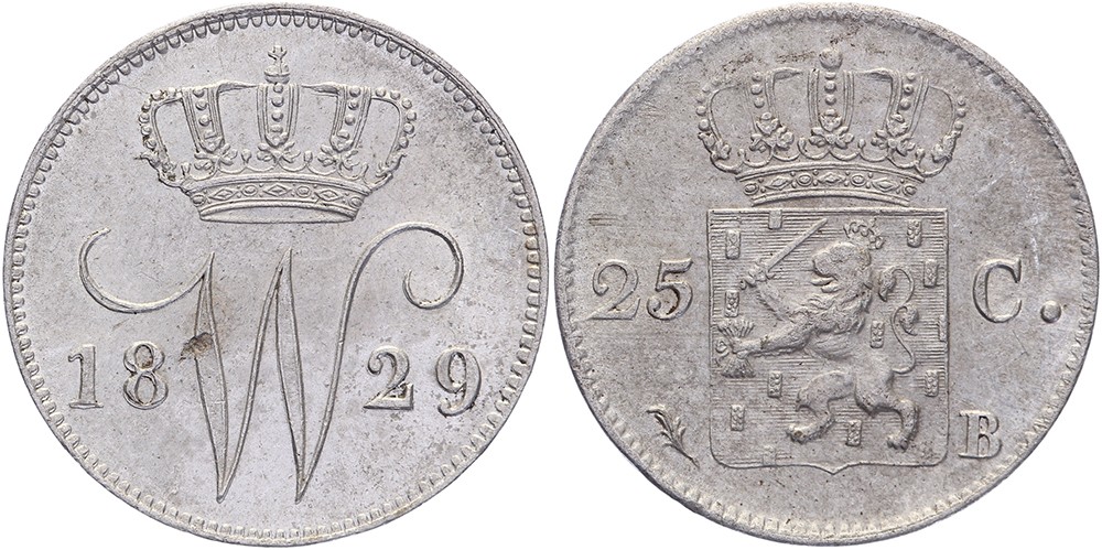 25 Cents 1829 Brussel mmt. palmtak Sch. 300. Muntplaatfoutje vz. Vrijwel prachtig