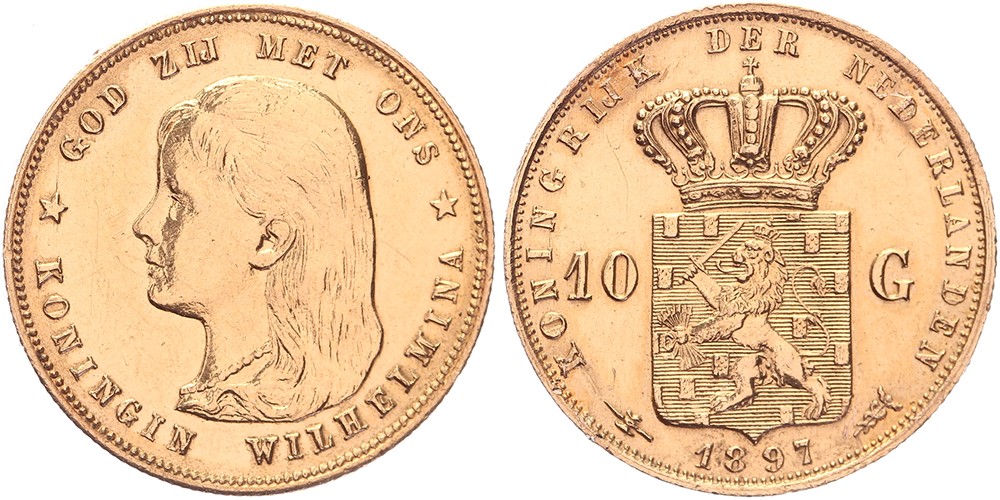 10 Gulden 1897 mmt. hellebaard Sch. 742. Licht gepoetst Zeer fraai