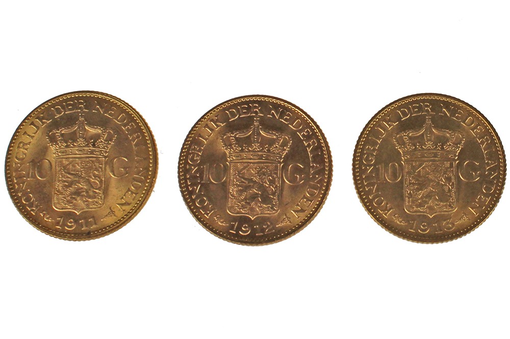 Lot (3) 10 Gulden 1911, 1912 en 1913 Sch. 745, 746 en 747 Prachtig