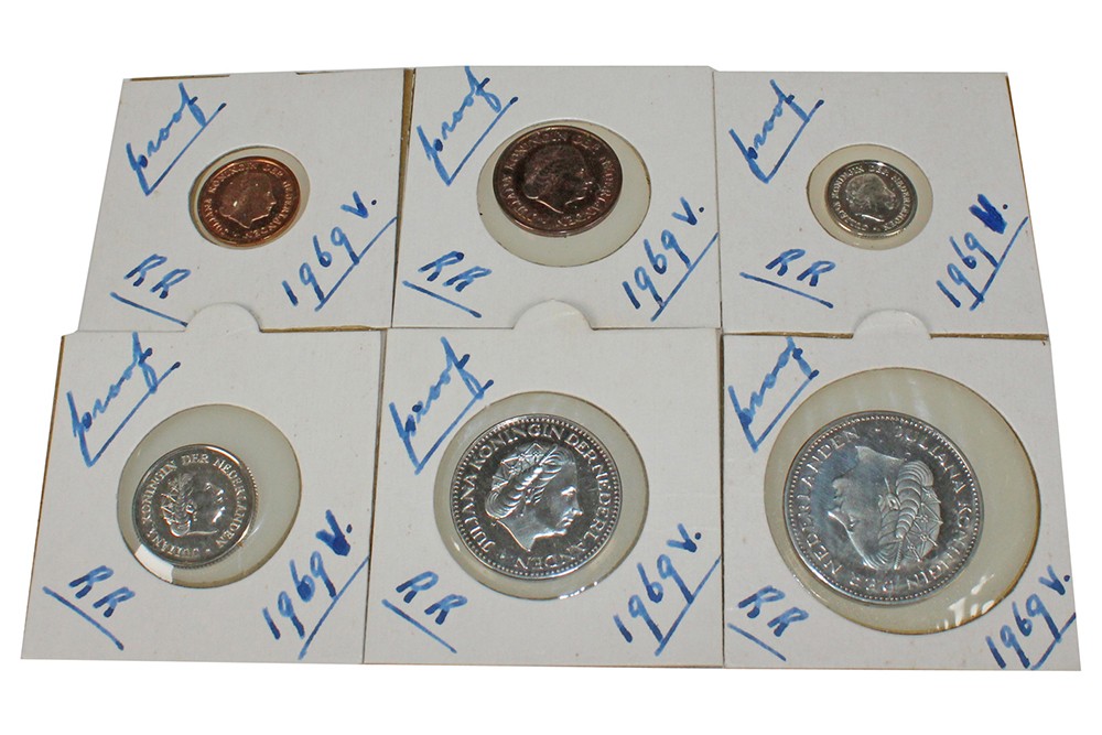 Proofserie 1969 visje in munthouders; 1 – 5 – 10 – 25 cent en 1 – 2½ gulden.