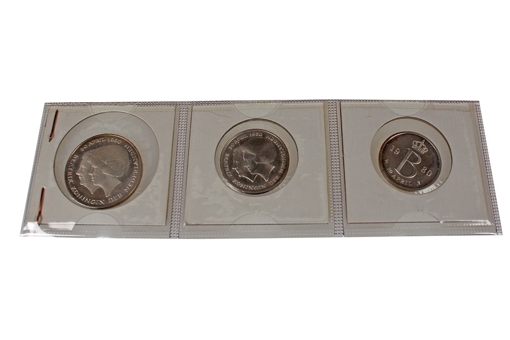 Inhuldigingsserie 1980; 1 + 2½ gulden + jaarpenning in zilver, echter zonder wit doosje. Met gepolijste stempels geslagen. FDC.