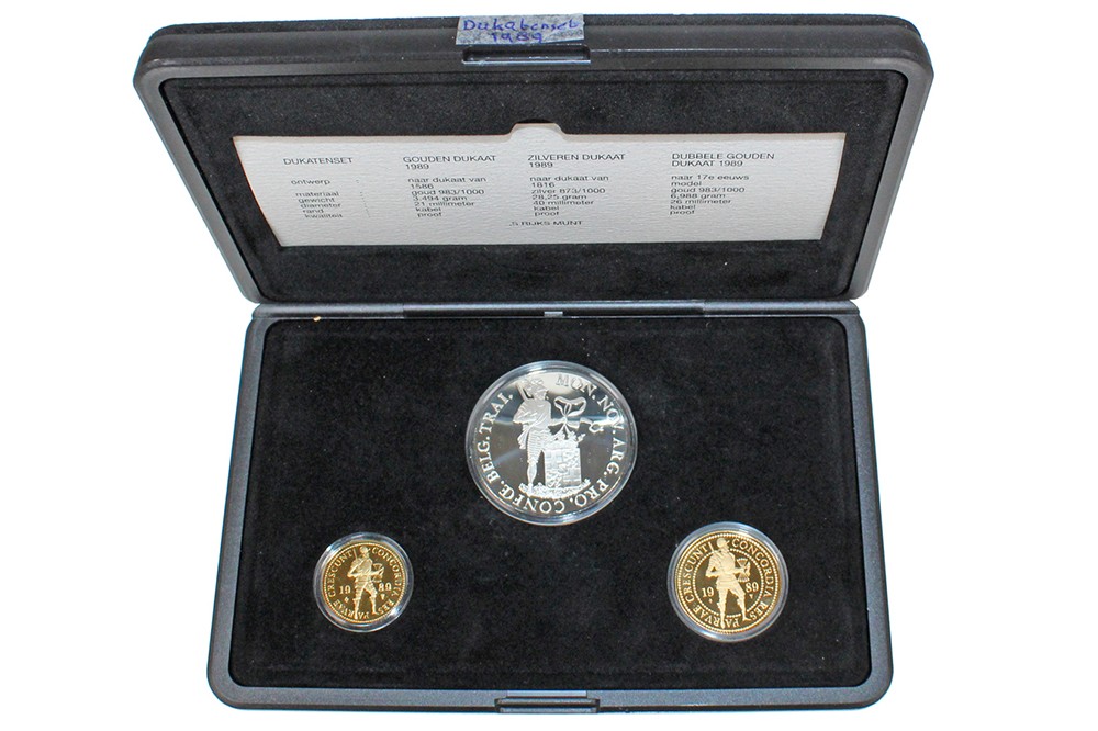 Dukatenset 1989; zilveren dukaat, enkele en dubbele gouden dukaat. Proof in cassette.