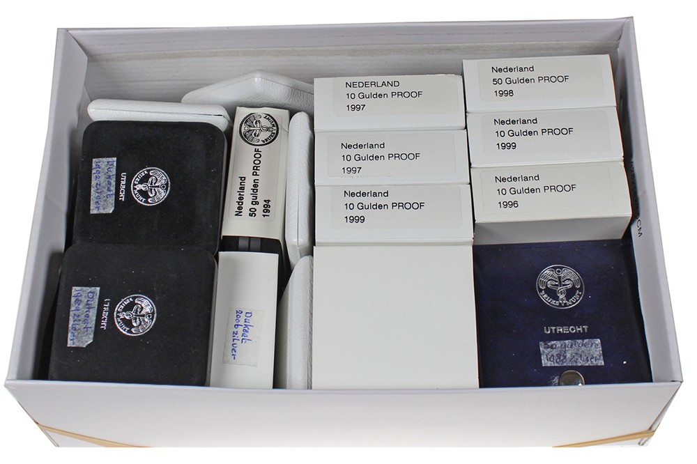 Doos (27) met 10-Gulden en 50-Gulden herdenkingsmunten in FDC en proof. Tevens 5 x zilveren dukaat diverse jaren.